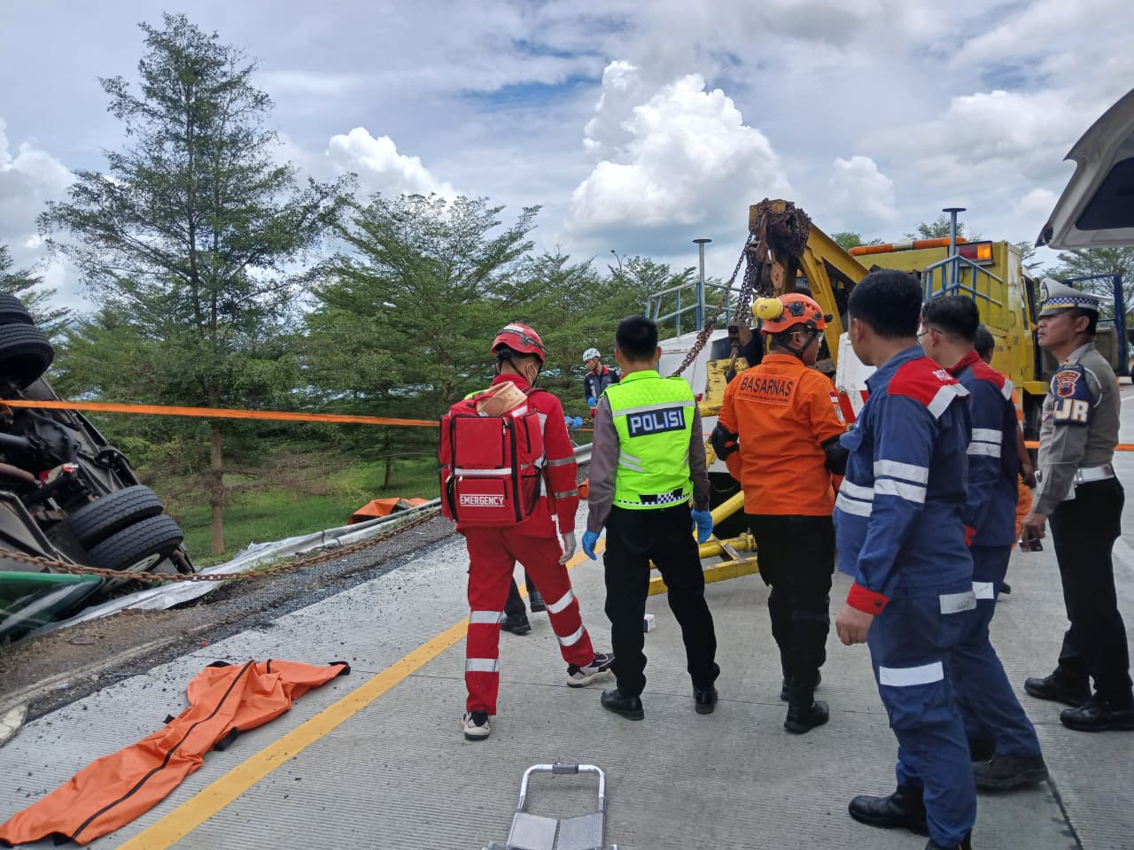 Bus berpenumpang 34 orang dengan tujuan tempat wisata Guci Kabupaten Tegal itu tidak mampu mengendalikan laju kecepatan dan mengalami gangguan pada sistem pengereman saat melewati tikungan di jalur keluar tol yang menyebabkan menabrak pembatas jalan dan terguling.
